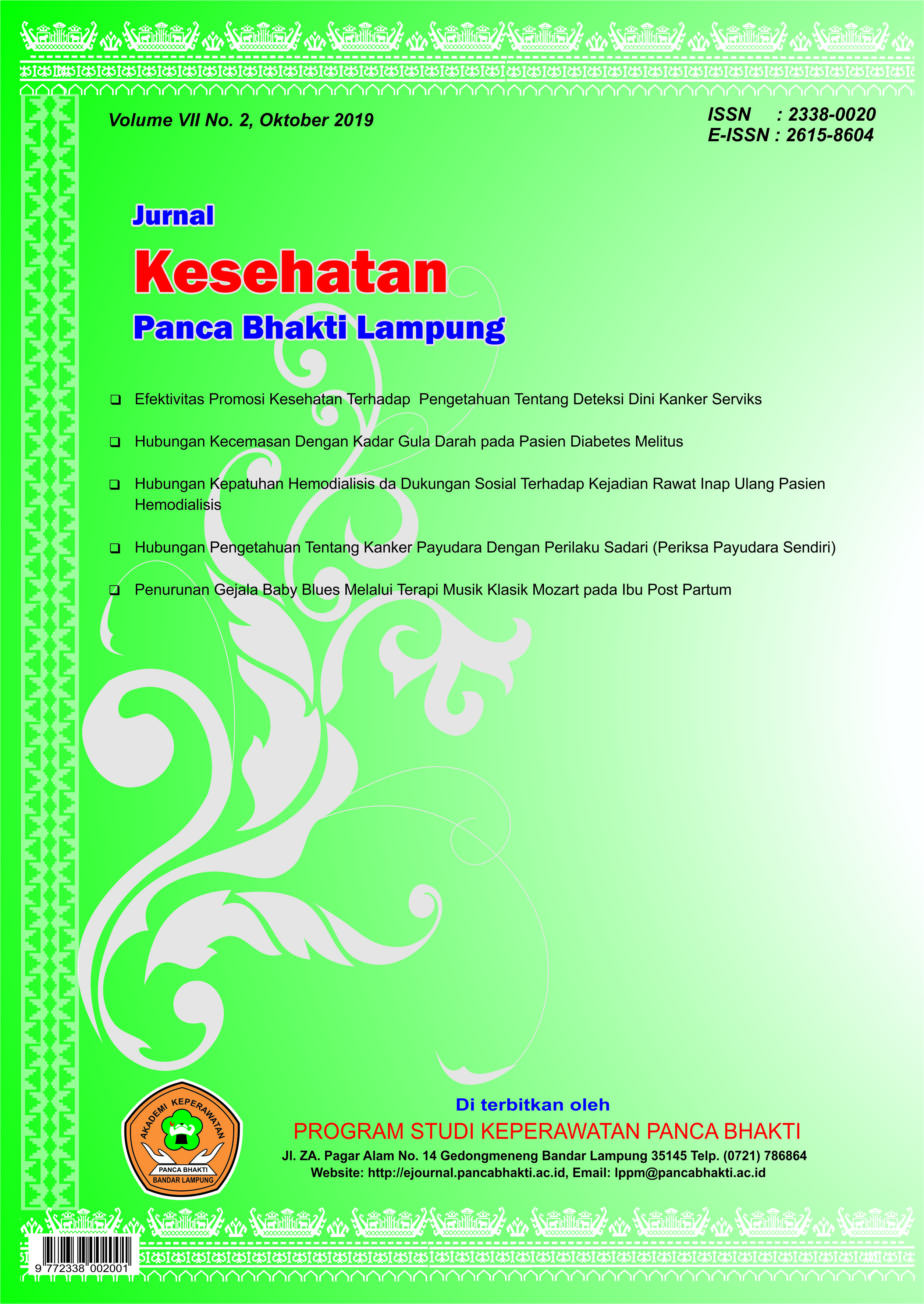 Cancer incidence in Indonesia (136.2 / 100,000) ranks 8th in Southeast Asia and 23rd in Asia. In Indonesia, the incidence of cancer is more dominated by breast cancer, which is 42.1 per 100,000 population. Breast cancer that is found at an early stage is likely to heal approaching 95%, so that early detection tests are needed. One of the early breast cancer detection programs is Self Breast Examination (BSE) (P2PTM Ministry of Health, Republic of Indonesia, 2017). In 2016, as many as 53.7% of the population did not do BSE. This study aims to determine the relationship of knowledge about breast cancer with BSE behavior (Check Breast Self) in AKBID Panca Bhakti Bandar Lampung students in 2019. This study uses an observational analytic design through a cross-sectional approach to 133 midwifery students. The statistical analysis used was the chi-square test. The results showed that most midwifery students' knowledge was in the good category (43.8%). BSE behavior of midwifery students was mostly in the less category (73.7%). Statistically, there is no proven relationship between knowledge about breast cancer and BSE behavior (ρ = 0.420). Further research needs to be done with experimental methods in the form of pre-test and post-test about the effectiveness of video with BSE behavior.